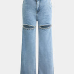 Időtlen, modern érintéssel, az Evian farmernadrágok a vintage ihletésű denimot merész és kortárs attitűddel ötvözik. A kopott részletek és strassz díszítések tökéletes egyensúlyt teremtenek a laza stílus és a diszkrét elegancia között. A egyenes és laza forma friss és laza aurát tart fenn, ideális szabadidős napokra vagy elegáns estékre.