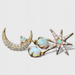 Égi és elbűvölő, ezek a fülbevalók arany árnyalatban egy finom hold és csillagok dizájnnal rendelkeznek, amelyet ragyogó opál kövek emelnek ki. Tökéletesen egyensúlyban a fantázia és elegancia között, álomszerű fényt kölcsönöznek a megjelenésednek, nappal vagy éjszaka.