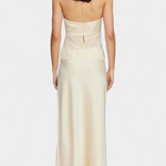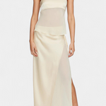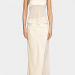 Modern és romantikus, a Fjorela szett egy ujjatlan, struktúrált felsőt kombinál aszimmetrikus midi szoknyákkal, tökéletes és kiegyensúlyozott megjelenést teremtve eseményekhez. Az átlátszó, kontrasztos részletek, a selyem drapéria és a gondos kidolgozás ezt a selyem szettet eleganciával ruházza fel, modern érintéssel.