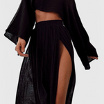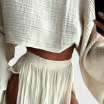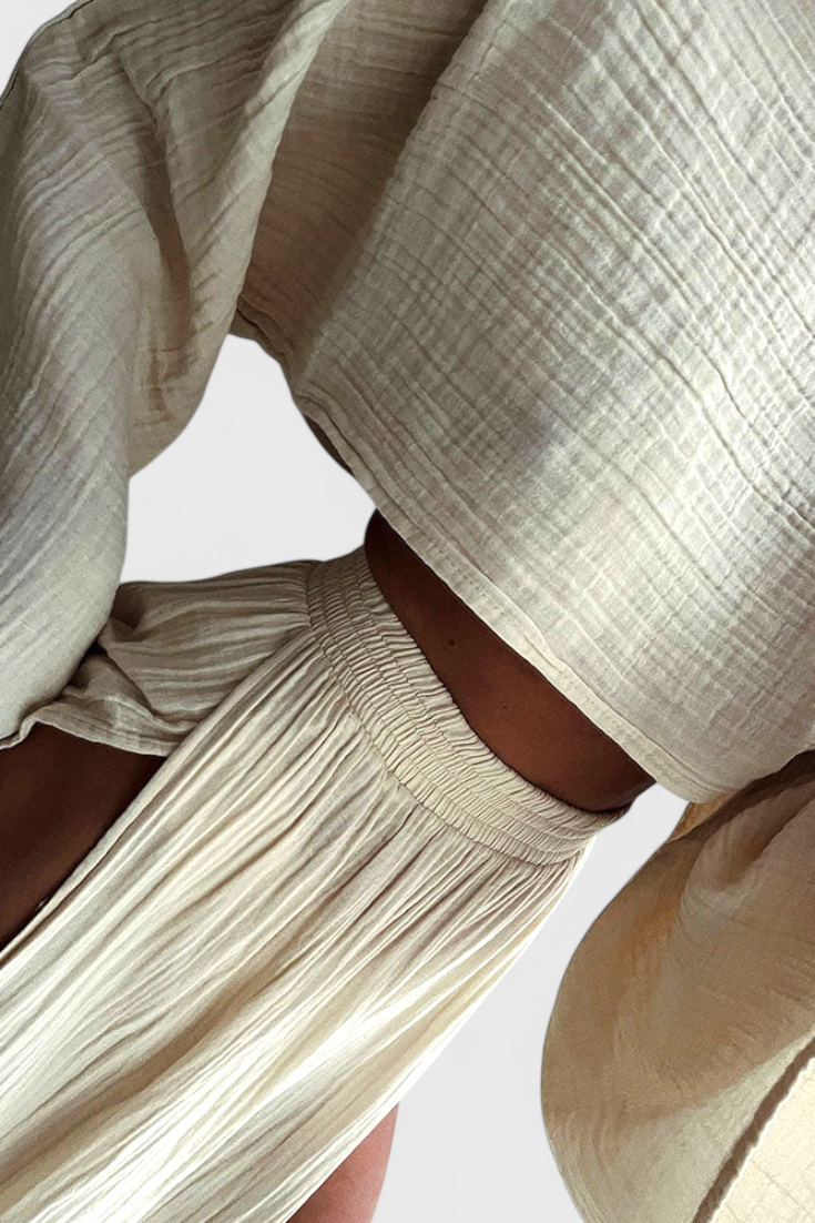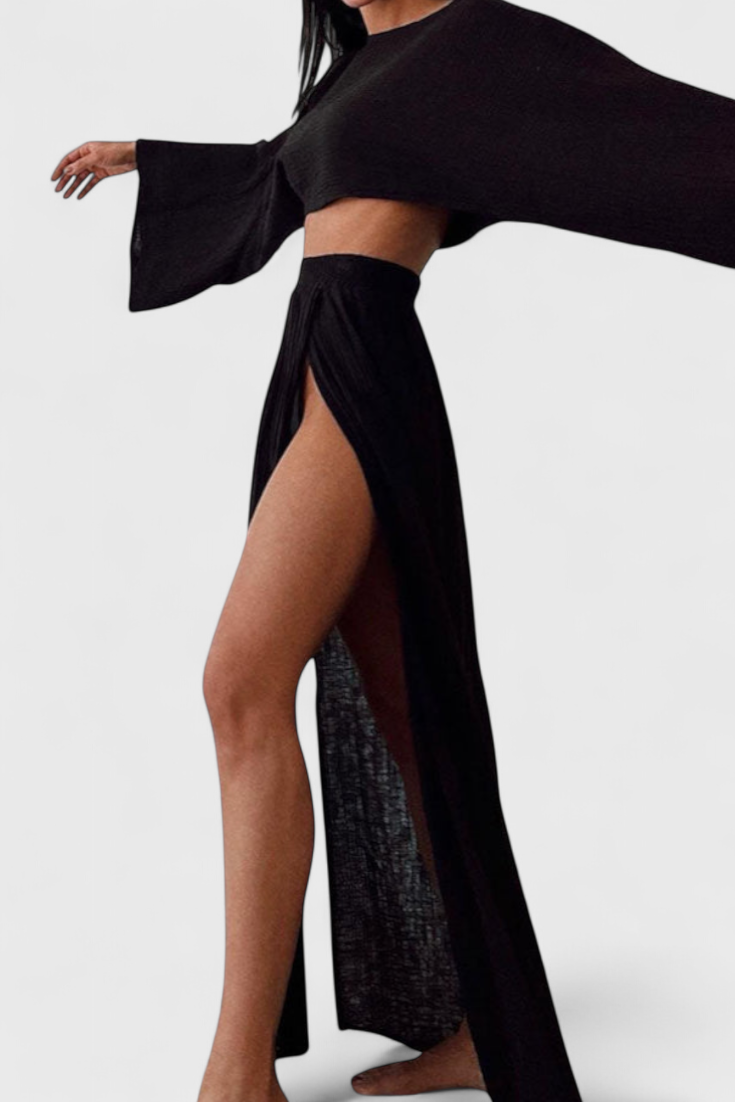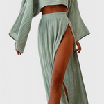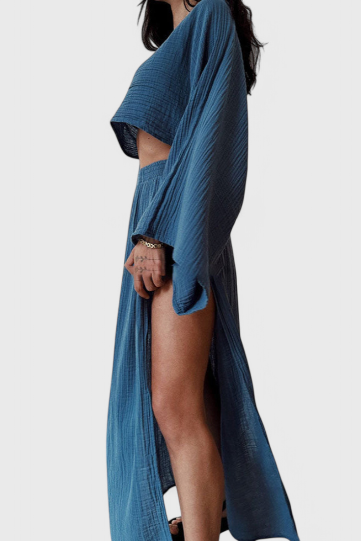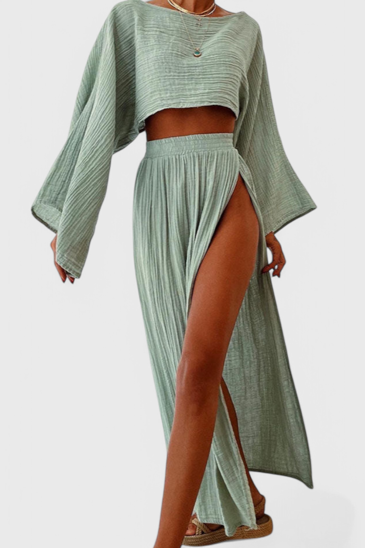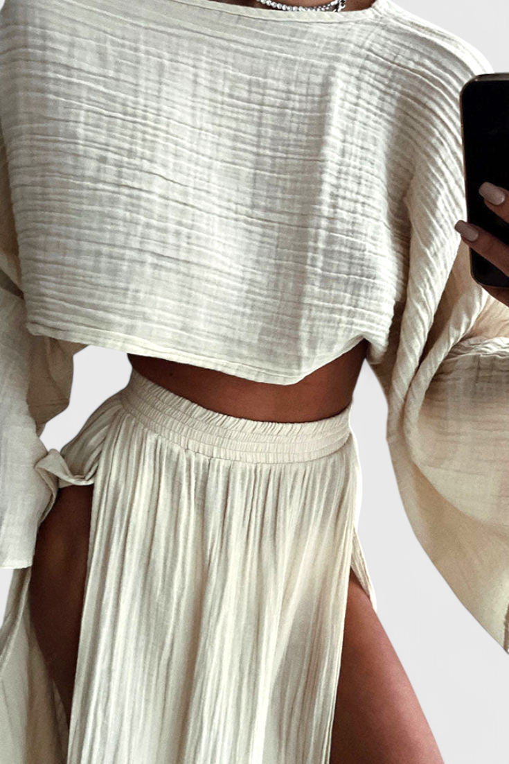 Könnyed, kifinomult és lenyűgöző—az Martha készlet egy modern stílust ötvöz a folyékony formákkal. A rövid top és az oldalsó hasítékkal rendelkező szoknya tökéletes egyensúlyt teremt az elegancia és a frissesség között, ideális napos napokra vagy különleges estékhez.