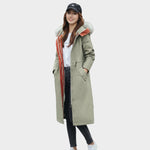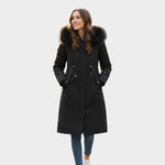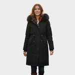 Ez a hosszú női kabát, kapucnival és szőrme béléssel ötvözi az eleganciát és a funkcionalitást az év leghidegebb napjain. Modern, állítható szabása kiemeli az alakot, míg a szőrme szegély elegáns és meleg érzetet ad.