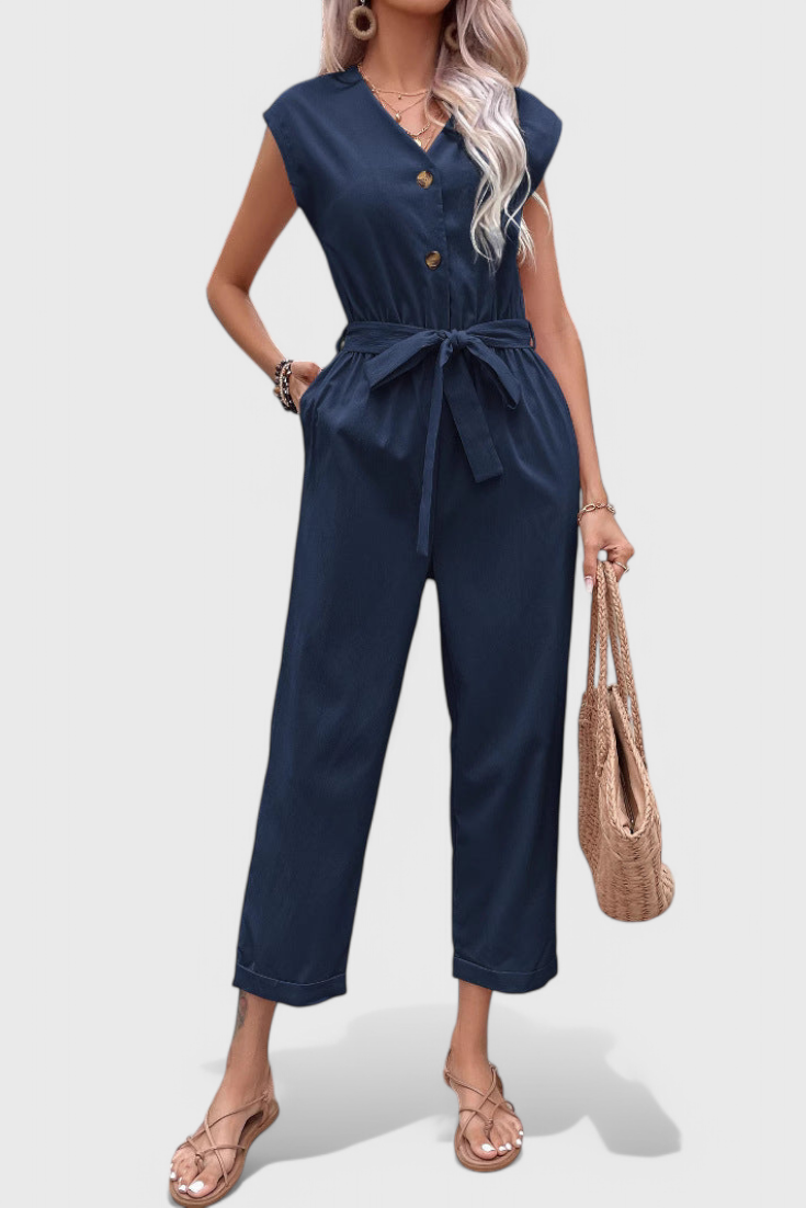Laza és erőfeszítés nélkül, a Marie a tökéletes választás meleg napokra, amikor kényelemre és könnyedségre van szükséged. Bokáig érő szabás, állítható derék szalaggal és puha pamut keverékből készült anyaggal, ez az ujjatlan overall a laza bájt ötvözi a gondosan megtervezett dizájnnal. Tökéletes sétákhoz, brunchokhoz vagy bármilyen programhoz napos időben.