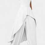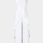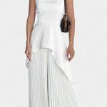 Elegáns minimalizmus, folyékony és kifinomult sziluettel. A Chrysoula szett egy ujjatlan topot kombinál, zárt nyakkivágással és aszimmetrikus struktúrával, valamint széles, plisszírozott nadrággal. A felsőtest struktúrája és a nadrág könnyedsége közötti kontraszt modern és kifinomult megjelenést teremt.