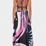 A Ciana szett a személyes kifejezést ünnepli a szín, forma és textúra által. A halter top a testhez simul, és modern érintéssel emeli ki a sziluettet, míg az A vonalú szoknya természetes mozgással áramlik, köszönhetően a sima szatén anyagnak. A fekete és rózsaszín absztrakt minta figyelemfelkeltő vizuális kontrasztot teremt, ideális, hogy nappal és éjszaka egyaránt kiemelkedj.