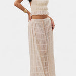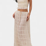 A könnyed elegancia és kifinomultság jegyében az Eugenie szett egy plisszált halter toppot kombinál egy magas derekú, folyékony szoknyával, amely elegánsan mozog. Lágy szerkezete, finom redőzése és romantikus bája ideálissá teszi napfényes szórakozásokhoz, kertben való találkozókhoz vagy elegáns nyári estékre.