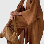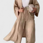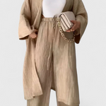 A kifinomult pihenés minden formája. A Kaspijas szett széles és áramló sziluettet kínál, amely bő nadrágokból és kimonó stílusú kabátból áll. Könnyű, ráncolt textúrája laza, de mégis elegáns aurát kölcsönöz, ideális meleg éghajlatokhoz és stílusos, nyugodt pillanatokhoz.