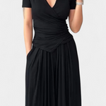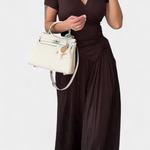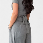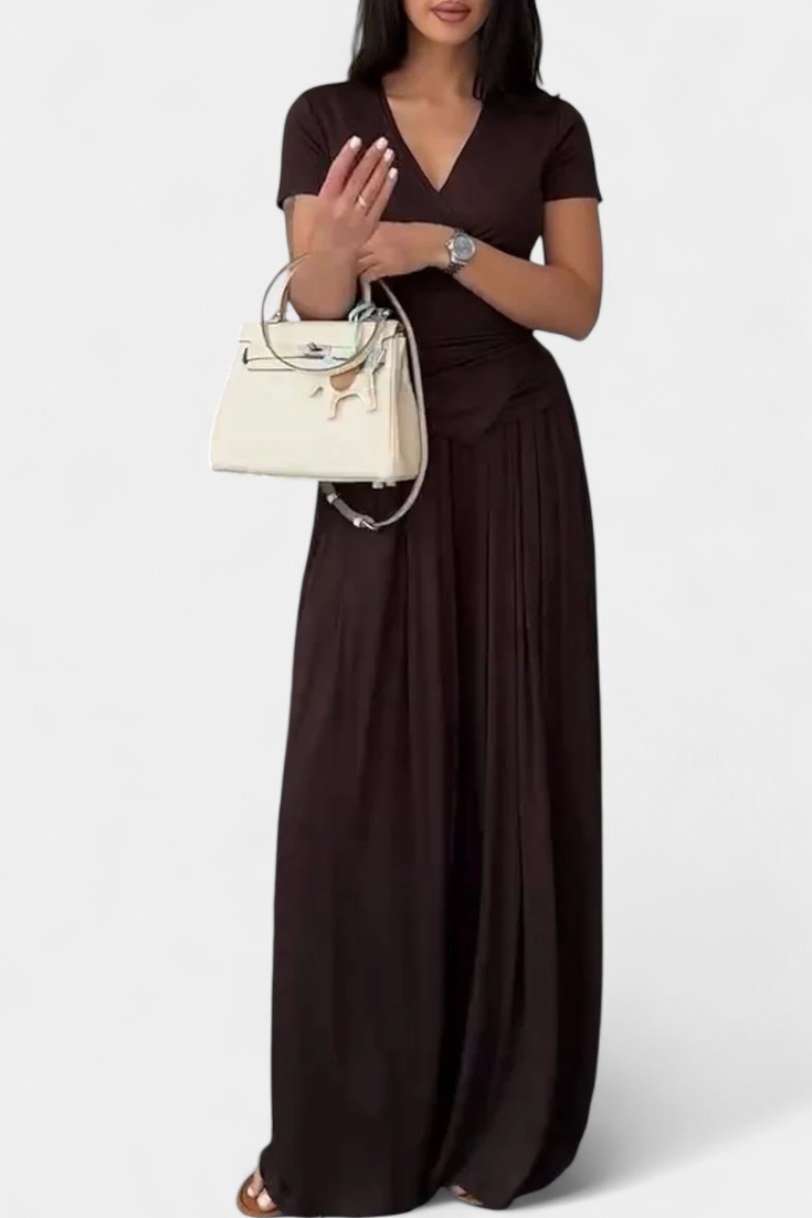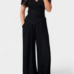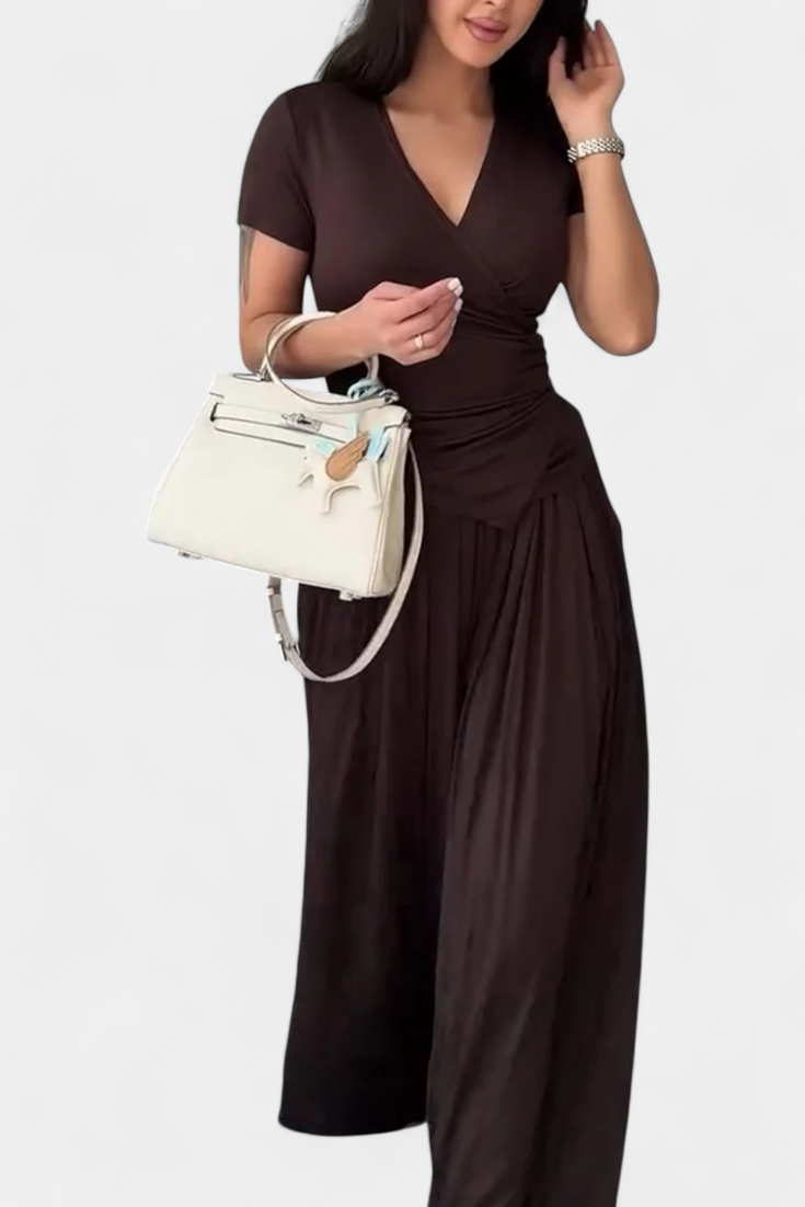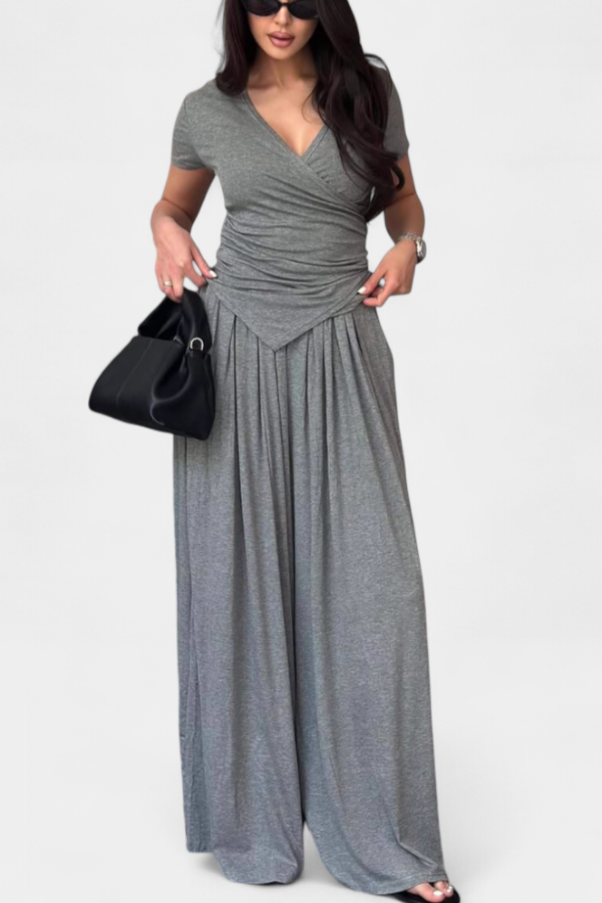 Modern kényelem nőies atmoszférával. A Ruslana készlet a puhaságot és a stílust ötvözi egy laza sziluettel, amely bármilyen ritmushoz alkalmazkodik. A keresztbe tett top természetesen kiemeli az alakot, míg a bő nadrágok szabadon áramlanak, létrehozva a tökéletes megjelenést a kecses mozgáshoz bármilyen informális eseményen.