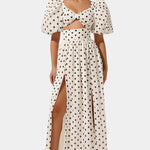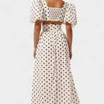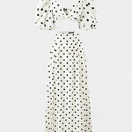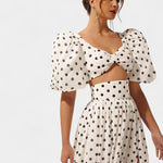 Egy nőies megjelenés, amely egyszerre vonzó és erős, ötvözve a klasszikust a merészséggel. A Sherine szett egy pöttyös mintájú toppot puff ujjakkal és egy elöl nyitott szoknyát kombinál, létrehozva egy jól definiált sziluettet, amely bájjal és magabiztossággal tűnik ki. Tökéletes, hogy bármilyen alkalommal ragyogj, erőfeszítés nélkül.