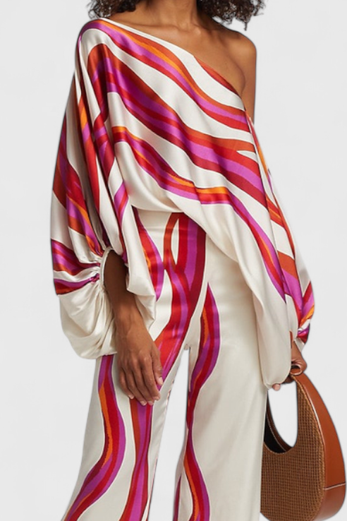 A Sybella szett egy lezser vállú blúzt és voluminos ujjas darabot kombinál széles, művészi mintázatú nadrággal. Az áramló, egyedi sziluett érdekében tervezték, ideális napos napokra, pihentető kiruccanásokra vagy stílusos találkozókra.