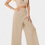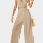 Egy olyan design, amely a laza eleganciával kíván kitűnni. A Valentina szett egy rövid, nyitott hátú csipkeblúzt és magas derekú, széles nadrágot kombinál, létrehozva egy folyékony és kifinomult sziluettet. A V-nyak és a nőies részletek romantikus légkört kölcsönöznek, míg a könnyű anyag frissességet biztosít a melegebb napokon.