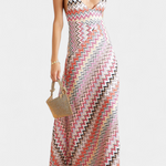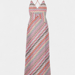 A stílus ikonjának lenyűgöző megjelenése minden egyes szálban. A Francia ruha életre kelti a vibráló zig-zag csíkok esszenciáját egy színes kötött anyag dizájnjával, amelyet fényes fém szálak hangsúlyoznak. Mély V-dekoltárja és a hátsó keresztpántok tökéletes egyensúlyt teremtenek a szexualitás és a kifinomultság között, míg a hosszú, folyékony szoknya éteri mozgást kölcsönöz.