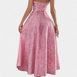 Sofisztikált attitűd, hogy stílusosan ragyogj minden alkalommal. A Gilda ruha a jacquard szövet luxus textúráját ötvözi egy nőies siluettel és merész akcentusokkal. Mély dekoltázsa és állítható pántos nyitott háta elegánsan és karakteresen emeli ki az alakot.