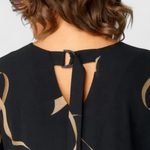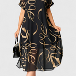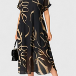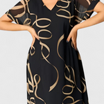 A pihenés luxusa művészi érintéssel, amely könnyedén lenyűgöző megjelenést teremt. A Jillian ruha egy absztrakt mintát kombinál arany és bézs árnyalatokban fekete háttéren, széles és légies siluettel. V nyakkivágása és rövid ujjai természetes eleganciát kölcsönöznek, míg a puha szövet összetétele kényelmet biztosít egész nap.