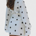 Laza stílus, vintage hangulattal, amely minden lépésnél magára vonja a tekinteteket. A Romara ruha kiemelkedik keresztbe álló sziluettjével, hosszú és dús ujjaival, valamint egy bájos pöttyös mintával, amely elefántcsont háttéren található. Egy sokoldalú darab, amely ötvözi a könnyedséget, a struktúrát és egy játékos attitűdöt.