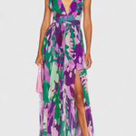 Lágy, vibráló és tele karakterrel. A Cecil ruha egy művészi mintát kombinál lila és zöld árnyalatokban, könnyed és nyitott siluettal, amely elegánsan mozog. Mély dekoltázsa, fedetlen háta és pliszírozott elemei fődarabbá teszik különleges eseményekre, nyaralásokra vagy szabadtéri vacsorákra.