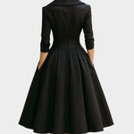 A dizájn jellemzője egy blézer stílusú keresztbe tett gallér, amely kifinomult és strukturált megjelenést kölcsönöz, míg a kiemelt derék és a dús szoknya egyensúlyos és elegáns formát teremt. A háromnegyedes ujjak egy kifinomult légkört biztosítanak, ideális eseményekhez, vacsorákhoz vagy hivatalos találkozókhoz.