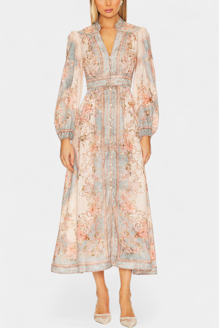 Dorotila Maxi Ruha Virágmintával, Gombokkal és Puffos Ujjakkal
