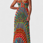 Egy mozgásban lévő műalkotás. A Janis ruha egy kézzel festett geometriai mintát kombinál egy A-vonalú, folyékony sziluettel, izgalmas hatást keltve. Szívformájú halterneck nyakkivágása és a deréknál lévő részletek nőies formát és elegáns légkört kölcsönöznek.