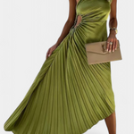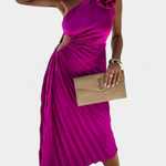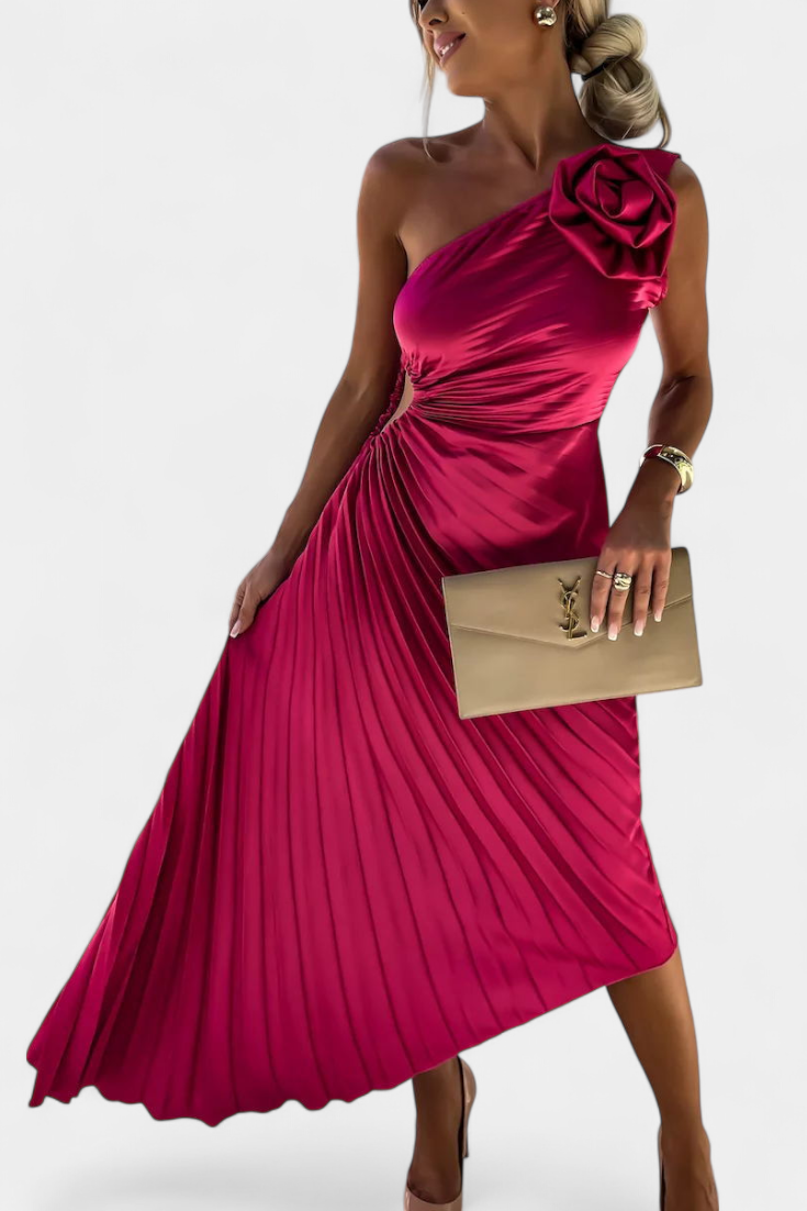 Modern elegancia művészi érintéssel. A Leire ruha újradefiniálja a koktélstílust aszimmetrikus, egyujjas sziluettjével és a vállon található finom virágapplikációval. A pliszírozott szoknya kifinomult mozgással áramlik, varázslatot teremtve, amely ideális különleges ünnepségekhez.