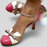 Elegáns magassarkú cipők patchwork dizájnnal: Ezek a cipők bájos kijelentést tesznek finom masni díszítésükkel és a boka körüli vékony pánttal. A kerek orr, közepes sarok és retró részletek kombinációja ideálissá teszi őket bármilyen alkalomra.