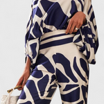 A Sybella szett egy váll nélküli blúzt és volános ujjú, széles nadrágot egy művészi mintával kombinál. A folyékony, személyiségjegyekkel rendelkező sziluett megtervezésére készült, ideális napos napokra, pihentető sétákra vagy elegáns eseményekre.